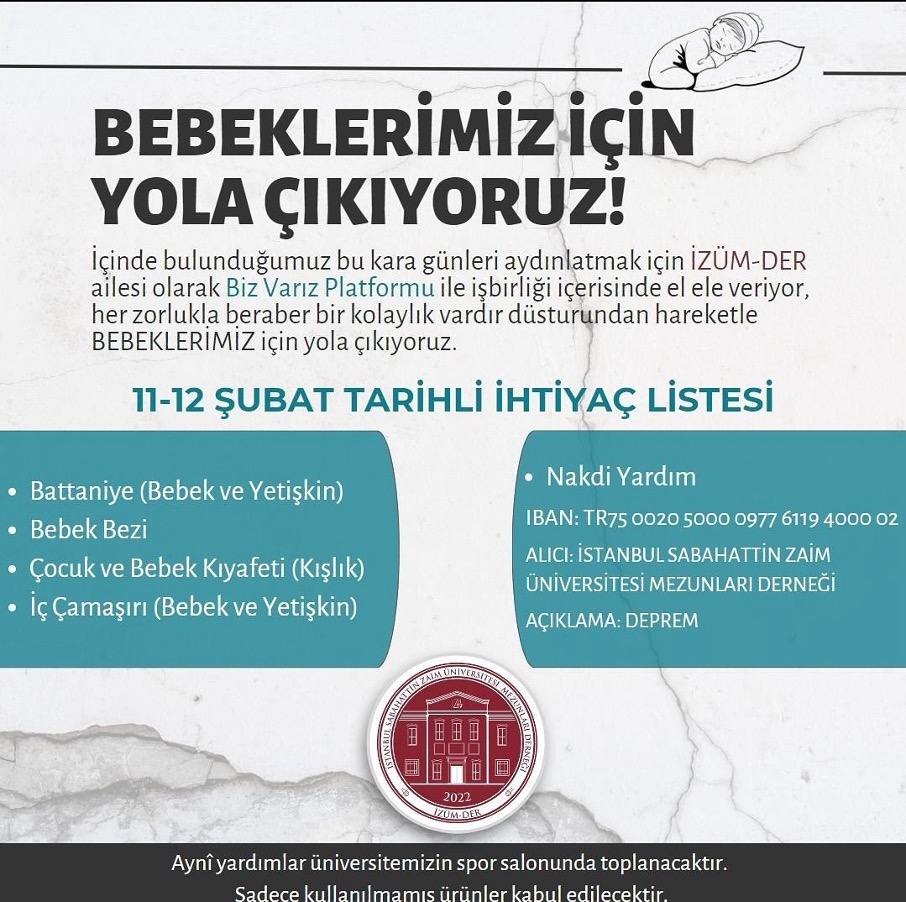İZÜM-DER ailesi olarak, Biz Varız Platformu ile el ele verip zor günlerde bebeklerimiz için bir yardım kampanyası düzenliyoruz.