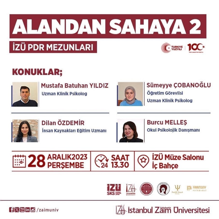 2019 mezunlarımızdan; Harmony Psikolojik Danışmanlık Merkezi Kurucusu Uzm. Psk. Mustafa Batuhan Yıldız, Okul psikolojik danışmanı Burcu Melleş, Biruni Üniversite Hastanesi İnsan Kaynakları Eğitim uzmanı Dilan Özdemir ve 29 Mayıs Üniversitesi öğretim görevlisi doktorant Sümeyye Çobanoğlu psikolojik danışmanlık bölümü öğrencileri ve akademisyenleriyle bir araya gelerek kariyer süreçlerini anlattı.